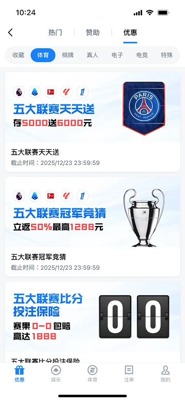 公告: 1、巅峰预言家:洞见赛果,亮出你的剧本 12月6日 20:30 阿斯顿维拉vs阿森纳 2、串关保险金 最高88888元 3、五大联赛比分投注保险!赛果0-0包赔 高达1888! 4、五大联赛冠军竞猜 立返50% 最高1288元! 5、EMC霸王餐100%包赔! 6、关于禁止国家队、俱乐部等相关职业成员参与游戏的声明 7、风控提醒 8、【EMC防诈骗】重要提示